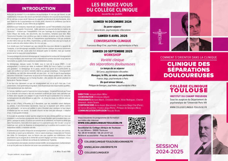 Le Collège clinique de Toulouse propose des formations orientées par la psychanalyse lacanienne, destinées aux professionnels et étudiants désireux de s’orienter dans le champ de la clinique par l’étude des concepts psychanalytiques et l’examen des pratiques.