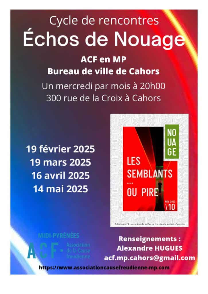 Le mercredi 14 mai prochain, nous nous retrouverons à 20h00 au 300 rue de la croix à Cahors et nous poursuivrons la lecture du texte de Virginie Leblanc « Quand les semblants vacillent, ni obéir, ni désobéir : intervenir », texte se trouvant dans le bulletin Nouage n°10 intitulé « Les semblants …ou pire » : https://www.acfnouage.fr/nouage-10-les-semblants-ou-pire.
