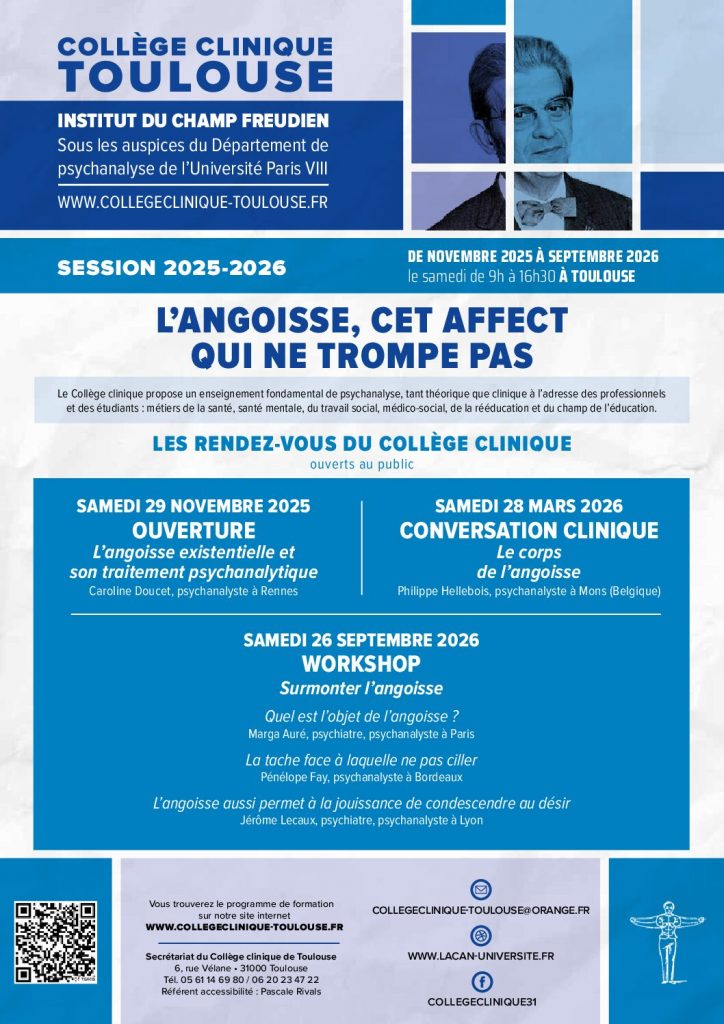 La session 2025/2026 du Collège clinique de Toulouse a pour thème L’angoisse, Cet affect qui ne trompe pas.