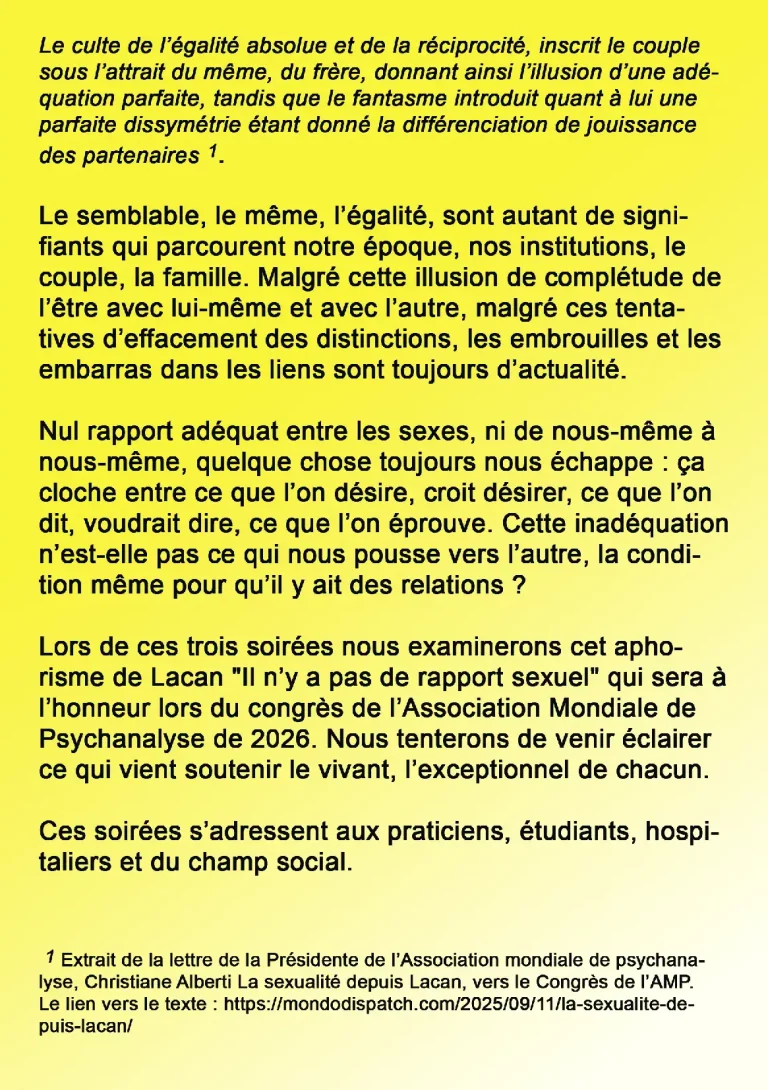 Lors de ces trois soirées nous examinerons cet aphorisme de Lacan « Il n’y a pas de rapport sexuel » qui sera à l’honneur lors du congrès de l’Association Mondiale de Psychanalyse de 2026. Nous tenterons de venir éclairer ce qui vient soutenir le vivant, l’exceptionnel de chacun.