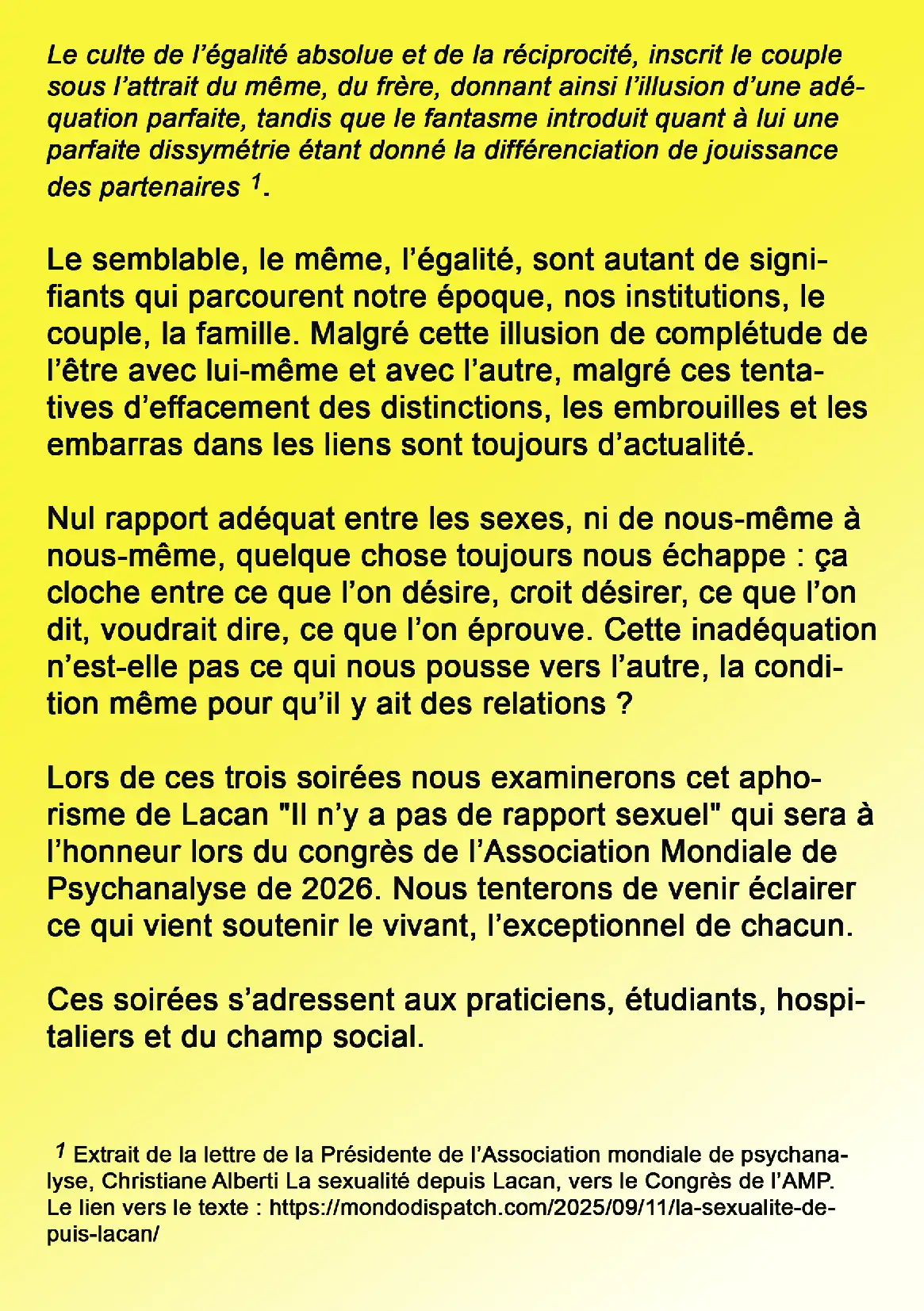 1 Extrait de la lettre de la Présidente de l’Association mondiale de psychana- lyse, Christiane Alberti La sexualité depuis Lacan, vers le Congrès de l’AMP. Le lien vers le texte : https://mondodispatch.com/2025/09/11/la-sexualite-de-puis-lacan/