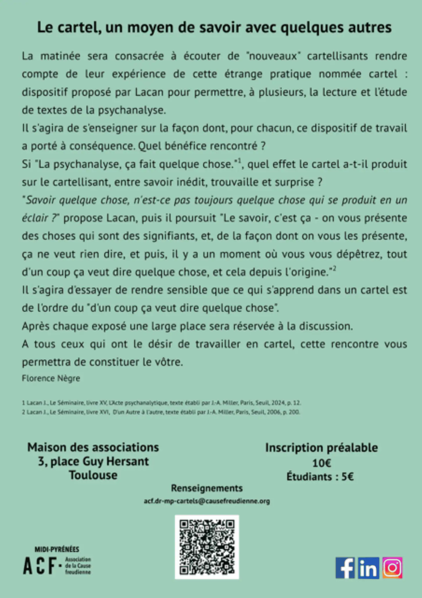 La matinée sera consacrée à écouter de « nouveaux » cartellisants rendre compte de leur expérience de cette étrange pratique nommée cartel : dispositif proposé par Lacan pour permettre, à plusieurs, la lecture et l’étude de textes de la psychanalyse.
