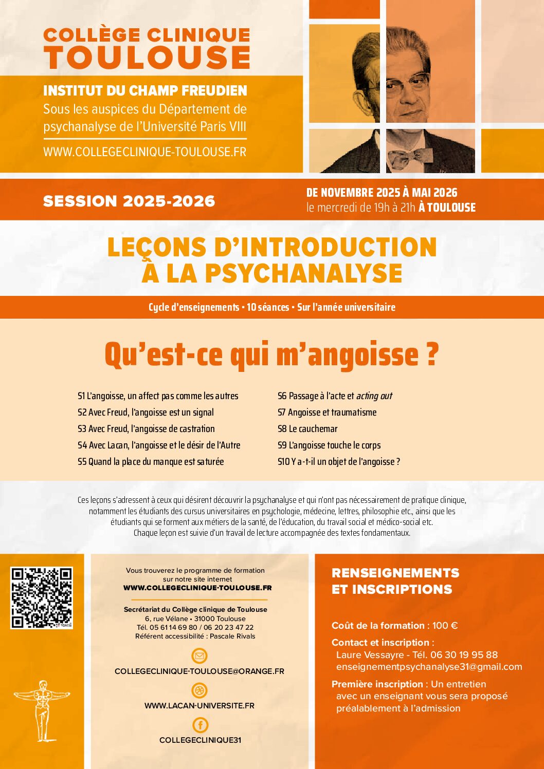 Le Collège clinique de Toulouse propose un cycle d’enseignements d’introduction à la psychanalyse, de 19h à 21h (10 mercredis sur l’année universitaire).