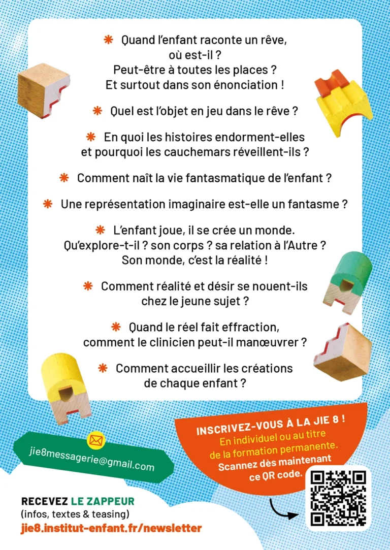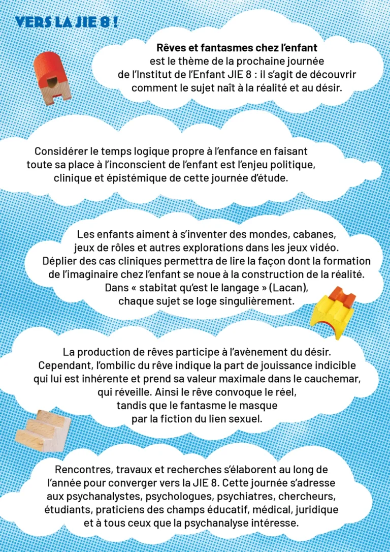 Les rêves et les fantasmes relèvent de l’inconscient de l’enfant. Mais de quoi sont-ils faits ? À quoi servent-ils ? Sont-ils des corps étrangers [1] ou permettent-ils de continuer à dormir ? « L’inconscient, c’est très exactement l’hypothèse qu’on ne rêve pas seulement quand on dort [2] », indique Lacan. Si Freud situe la mise en place de l’inconscient après le refoulement de la sexualité infantile, avec Lacan la psychanalyse s’oriente du réel qui fait trou, indicible, auquel tout parlêtre est confronté. Elle ouvre dès lors sur une autre définition de l’inconscient, l’inconscient réel, « comme l’impossible à supporter [3] ». S’intéresser à ces deux termes, rêves et fantasmes, chez l’enfant est une invitation à s’enseigner sur la façon dont le sujet se défend du réel. Il s’agira donc lors de cette 8e journée de l’Institut psychanalytique de l’Enfant du Champ freudien d’explorer comment les rêves et les fantasmes indexent un réel pulsionnel ainsi que des moments de constitution subjective. Il sera également question de découvrir comment le sujet naît à la réalité et au désir [4], selon la formule de Daniel Roy dans son texte de présentation.