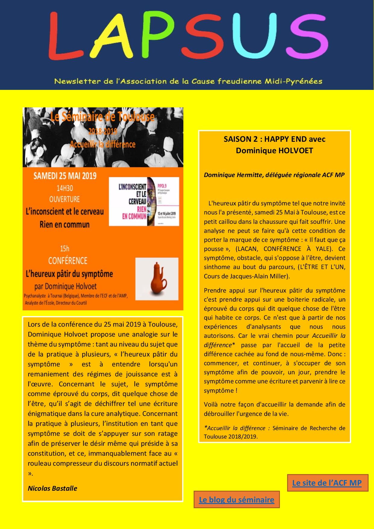 Le Samedi 25 Mai dernier, le Séminaire de Toulouse invitait Dominique Holvoet sous le titre "L'heureux pâtir du symptôme".