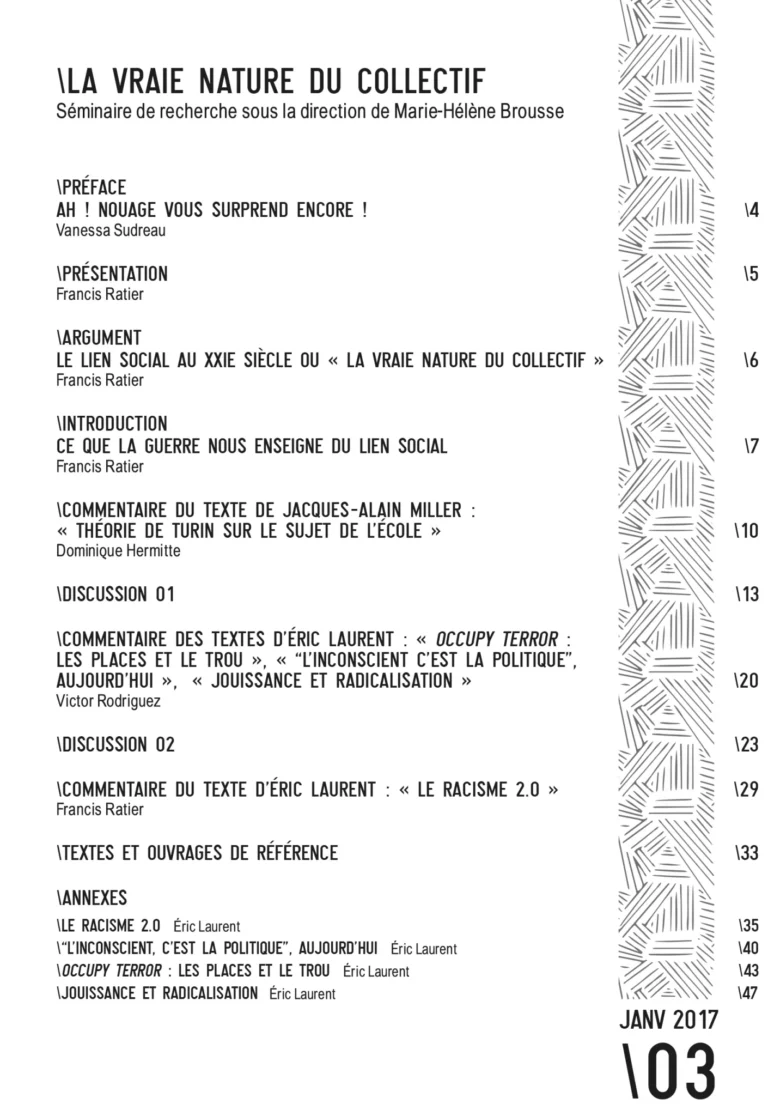 Quelques jours après les terribles attentats perpétrés le 13 novembre 2015 à Paris, un séminaire exceptionnel de recherche, prévu de longue date, s’est déroulé à Toulouse sous la conduite de Marie-Hélène Brousse : « La vraie nature du collectif »[1].